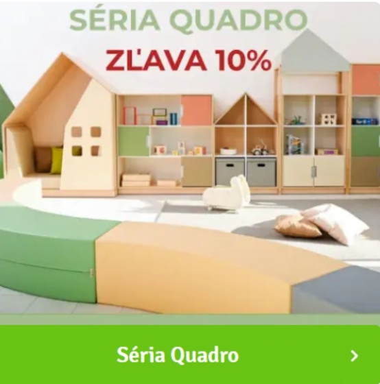 Využite aktuálnu zľavu 10 % na nábytkovú sériu Quadro od InsGrafu – moderné, variabilné a farebne prispôsobiteľné riešenie pre vybavenie jaslí, materských aj základných škôl. Séria Quadro ponúka široký výber skriniek, regálov a úložného nábytku, ktorý je možné ľahko kombinovať podľa potrieb interiéru a veku detí. Akcia platí na vybrané produkty tejto série v e-shopeInsGraf – ideálne pre školské prostredia aj kreatívne priestory.